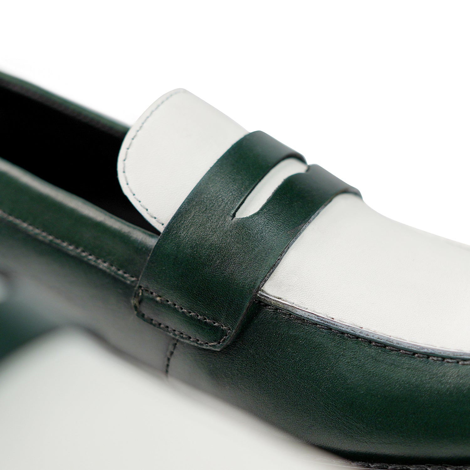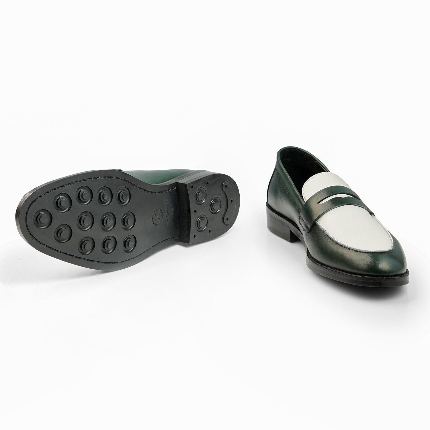 White-Green Combination Penny Loafers — Who said leather is only made for formal wear? We have designed this gem in the most stylish way possible. Made from crust leather. This green-white pair stands out with its sharp contrast and strong appeal. Each pair is handmade with love by experienced labours, ensuring detailing, comfort, and durability in every stitch. The sleek design adds effortless class to both casual and formal looks. With extra padded soft cushion and a sturdy sole, they’re built for all-day comfort without losing elegance.